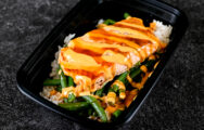 Spicy! Grilled salmon topped with firecracker sauce. Served with jasmine rice, feta, and green beans.340 Calories33.0 g PROTEIN33.0 g CARBS13.0 g FATS - 340 Calories33.0 g PROTEIN35.0 g CARBS8.0 g FATS4.0 g FIBER