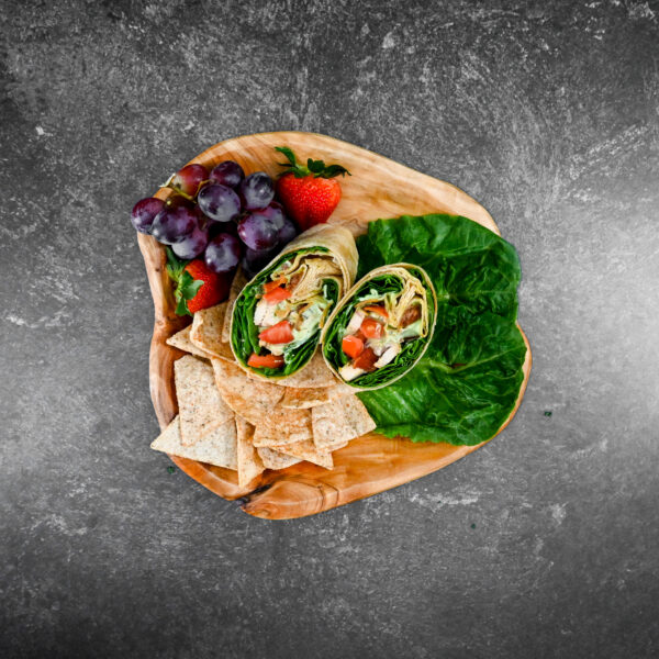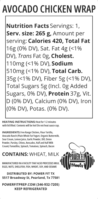Ingredients: Free Range Chicken, Avocado Ranch (PFM Ranch: Yogurt, Plain, Whole Fat, Organic, Buttermilk, Sour Cream, Lemon Juice, Garlic Powder, Dill, Onion Powder, Parsley, Chives), Avocados, Half and Half (Milk, Cream), Tomatillos, Spinach, Salt, Garlic Powder), Enriched bleached wheat flour (flour, niacin, iron, thiamine mononitrate, riboflavin), water, vegetable shortening., Tomatillos, Spinach, Bacon