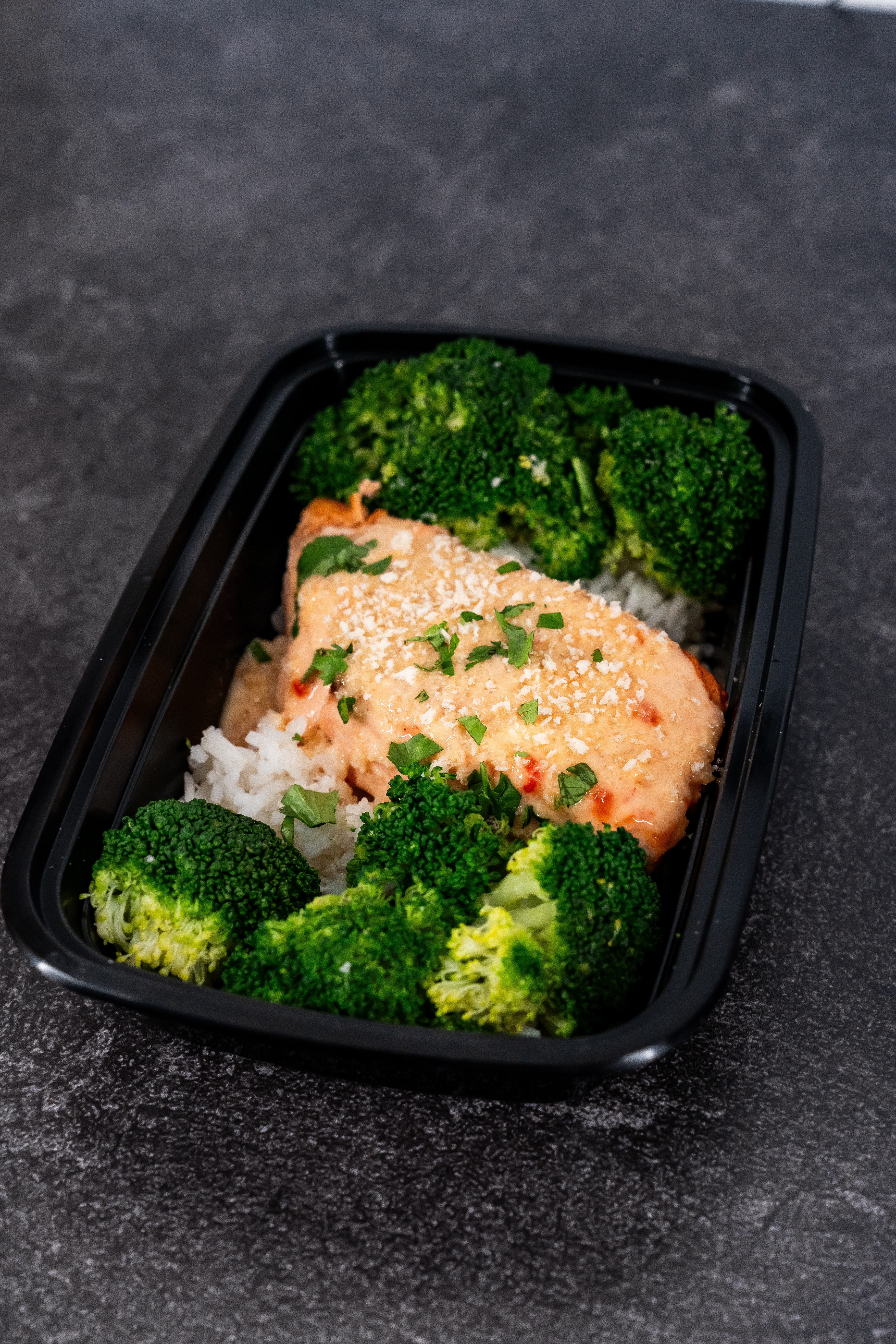 FLAKY GRILLED SALMON TOPPED WITH OUR IN-HOUSE MADE “BANG BANG” SAUCE SERVED WITH RICE, AND BROCCOLI