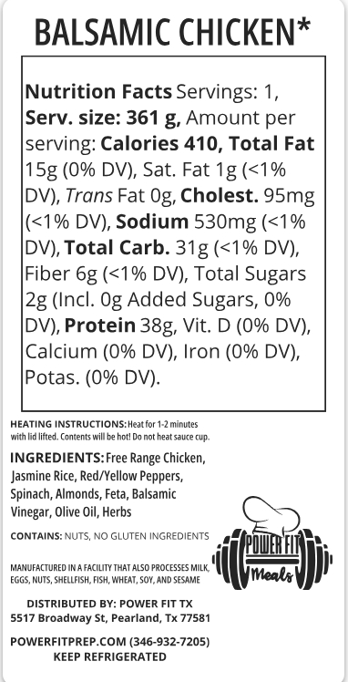 Sliced chicken breast, jasmine rice, bell peppers, spinach, almonds, feta and balsamic sauce!