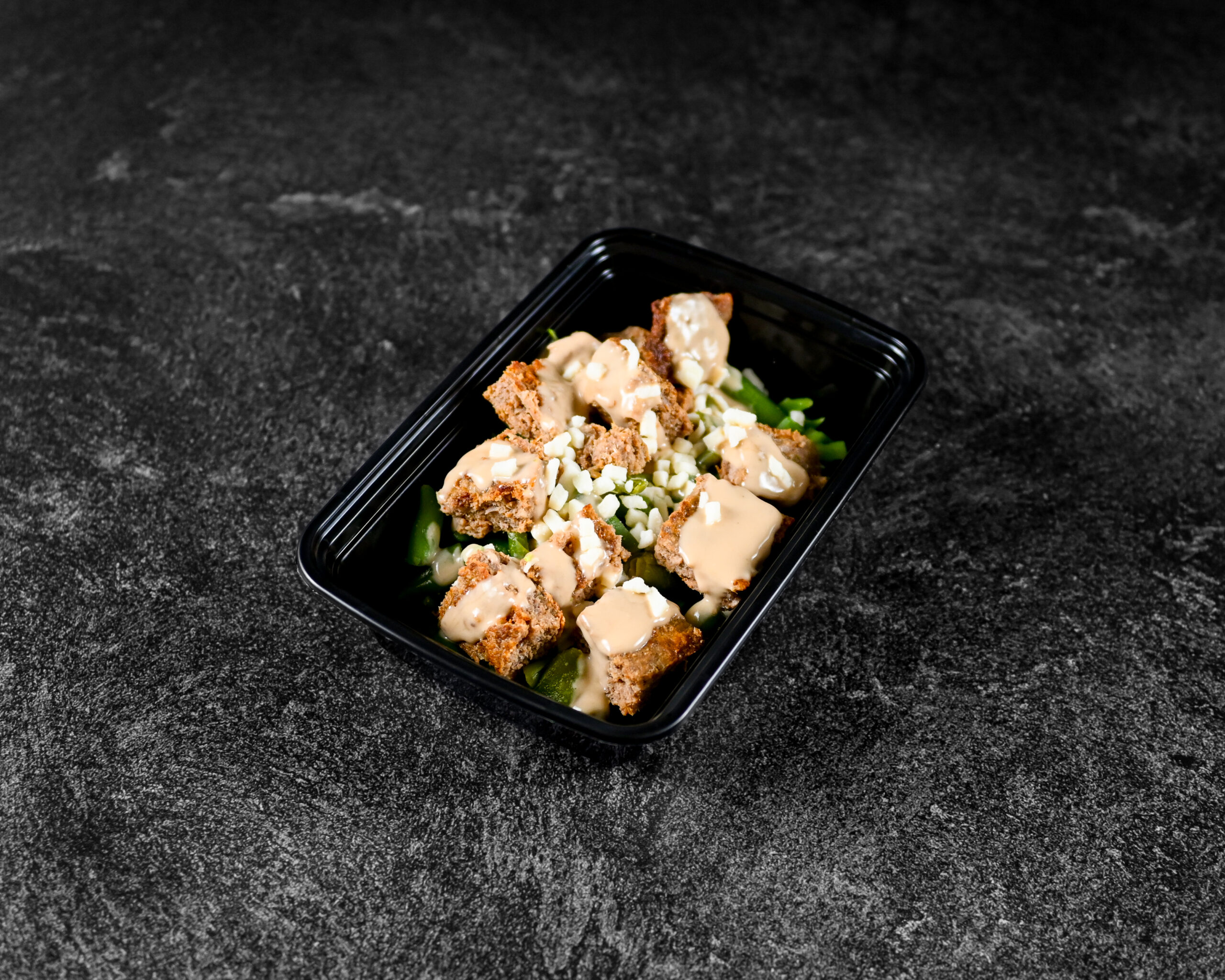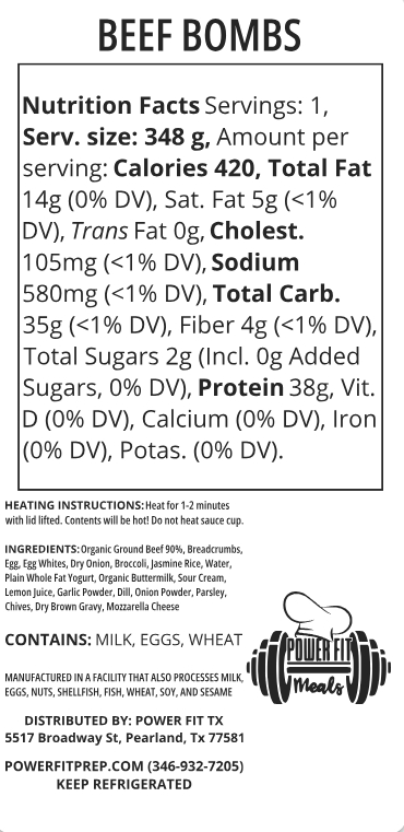 Ingredients: Organic Ground Beef 90%, Breadcrumbs, Egg, Egg Whites, Dry Onion, Broccoli, Jasmine Rice, Water, Plain Whole Fat Yogurt, Organic Buttermilk, Sour Cream, Lemon Juice, Garlic Powder, Dill, Onion Powder, Parsley, Chives, Dry Brown Gravy, Mozzarella Cheese