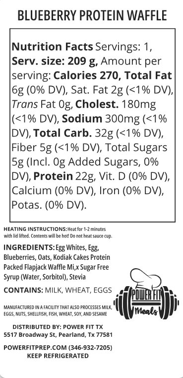 Ingredients: Egg Whites, Egg, Blueberries, Oats, Kodiak Cakes Protein Packed Flapjack & Waffle Mix, Sugar Free Syrup (Water, Sorbitol), Stevia