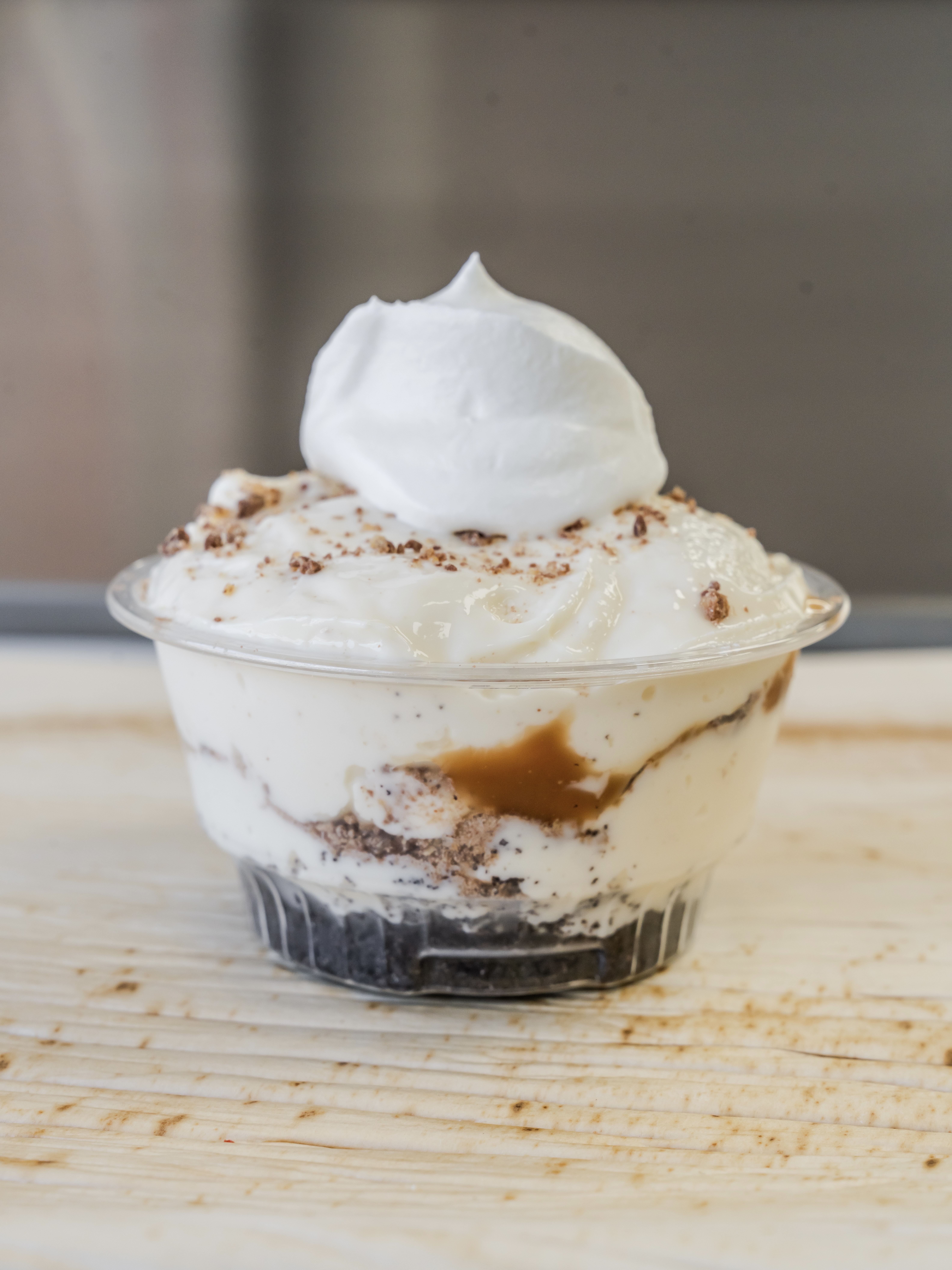 Chocolate protein cake, peanut butter filling, sugar-free caramel sauce, crushed butterfingers, Cool Whip sugar-free and whey isolate protein powder