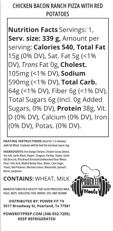 Ingredients: Free Range Chicken, Water, Parmesan, Chicken Gravy, Onion, Sea Salt, Garlic, Black Pepper, Oregano, Parsley, Thyme & Garlic Oil, Potatoes, Enriched Unbleached Flour (Wheat Flour, Niacin, Reduced Iron, Thiamine Mononitrate, Riboflavin, Folic Acid, Malted Barley Flour), Water, Cane Sugar, Non-GMO Expeller Pressed Soybean Oil, Yeast, Plain Whole Fat Yogurt, Organic, Buttermilk, Sour Cream, Lemon Juice, Garlic Powder, Dill, Onion Powder, Parsley, Chives, Low Sodium Marinara, Spinach, Mozzarella, Bacon