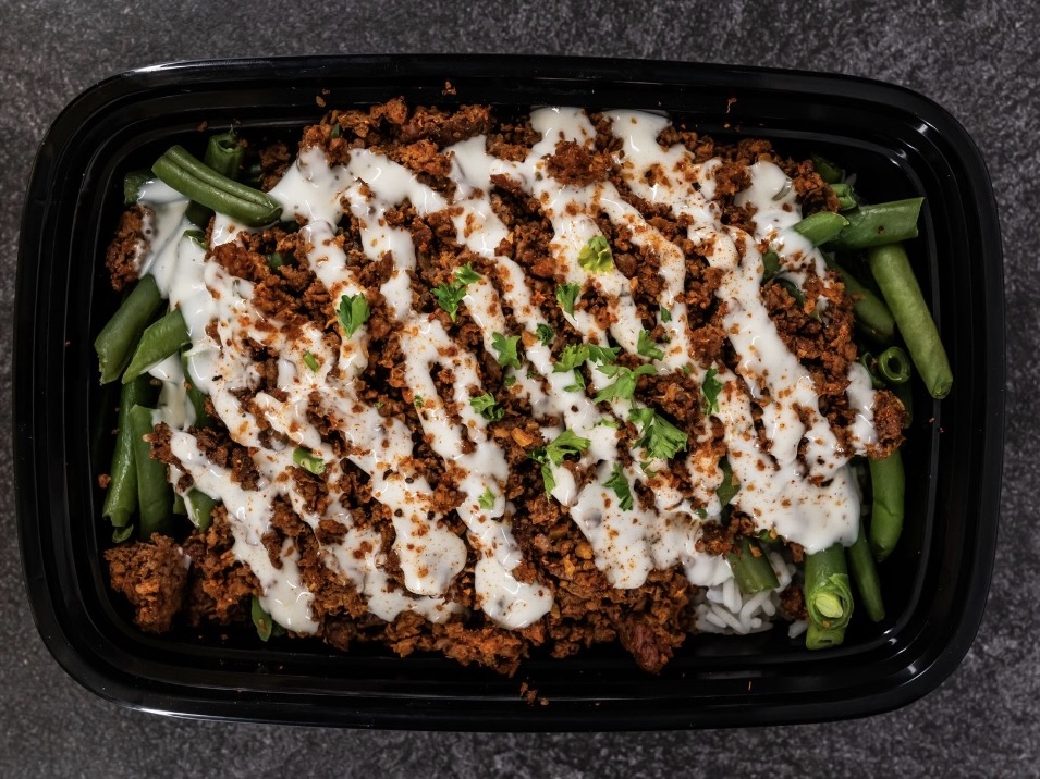 LEAN GROUND BEEF COOKED WITH RED PEPPER FLAKES AND SPICES. SERVED WITH GREEN BEANS JASMINE RICE AND A SPICY RANCH DRIZZLE
