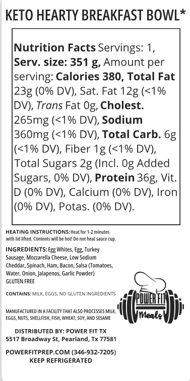 Ingredients: Egg Whites, Egg, Turkey, Water, Mozzarella Cheese, Low Sodium Cheddar, Spinach, Ham, Salsa (Crushed Tomatoes, Jalapeno Peppers, Diced Tomatoes in Tomato Juice, Onions, Distilled Vinegar, Salt, Onions, Garlic), Bacon