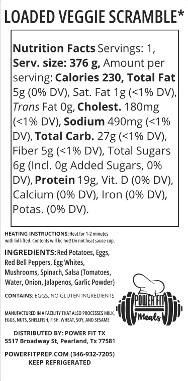 Ingredients: Red Potatoes, Egg Whites, Red Peppers, Egg, White Mushroom, Salsa (Crushed Tomatoes, Jalapeno Peppers, Diced Tomatoes in Tomato Juice, Onions, Distilled Vinegar, Salt, Onions, Garlic), Spinach