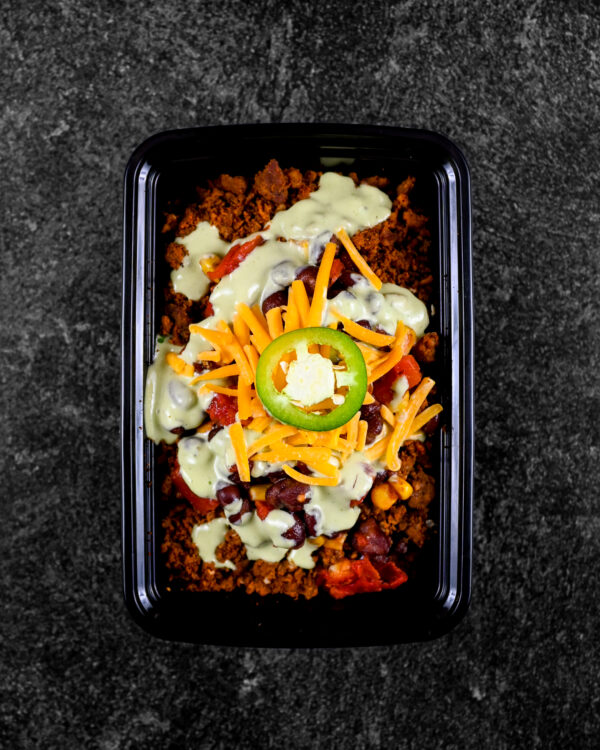 LEAN GROUND TACO BEEF SERVED OVER QUINOA, SWEET POTATOES, PICO, CORN, AND BLACK BEANS. TOPPED WITH CREMA, CILANTRO, AND A FRESH JALAPENO SLICE