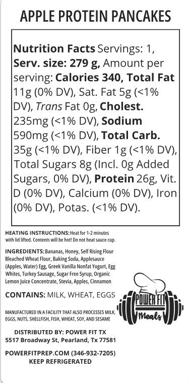 Ingredients: (Bananas, Honey, Self-Rising Flour (Bleached Wheat Flour, Leavening Baking Soda), Applesauce (apples, water), Egg, Greek Vanilla Nonfat Yogurt, Butter (Cream, Natural Flavor), Baking Powder (Cornstarch, Sodium Bicarbonate), Stevia, Salt, Cinnamon), Egg Whites, Egg, Turkey Sausage, Sugar Free Syrup (Water, Sorbitol), Organic Apples, Water, Organic Sugar, Organic Corn Starch, Organic Natural Flavor, and Organic Lemon Juice Concentrate.