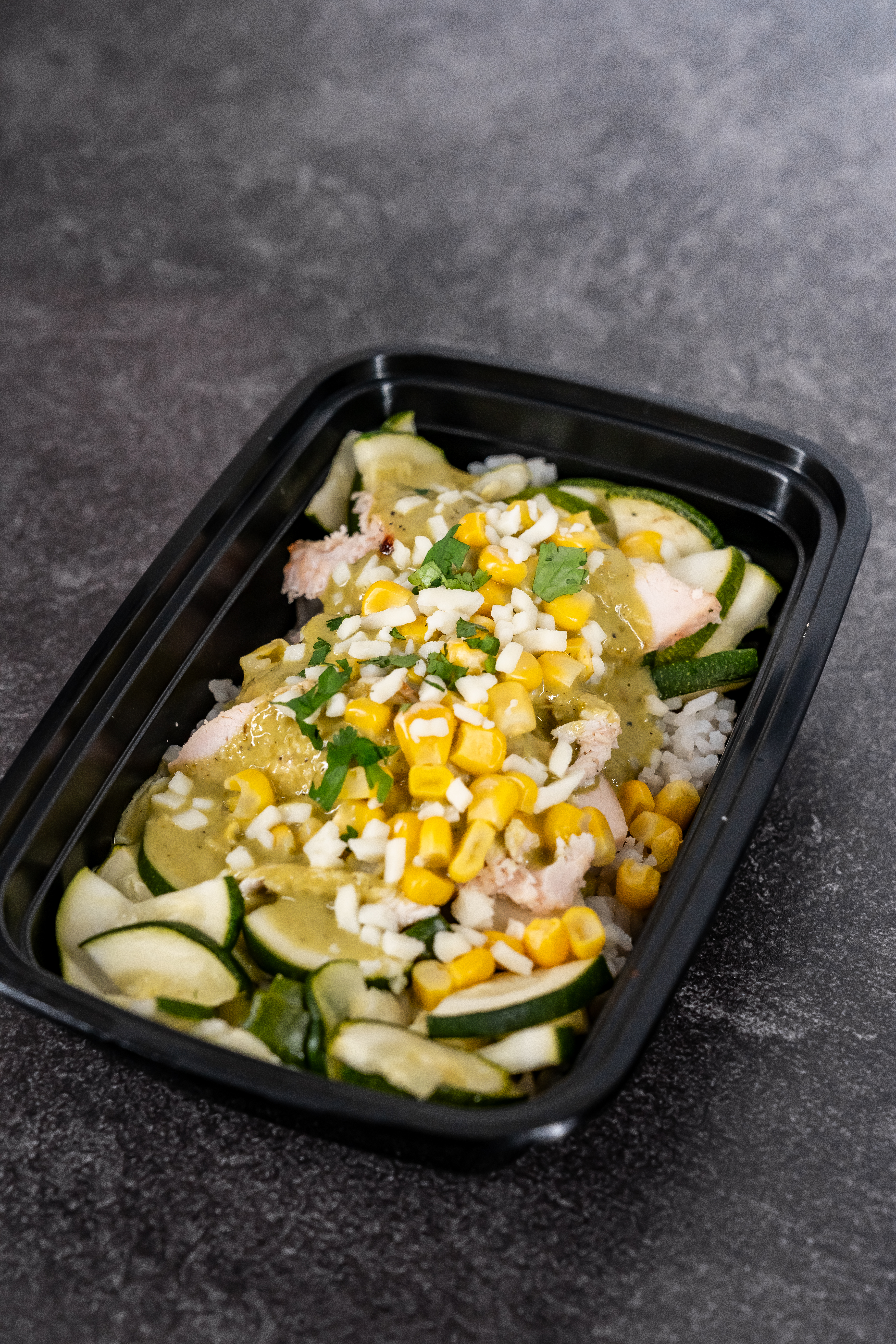 CHICKEN SERVED WITH RICE ZUCHINNI TOPPED WITH OUR SMOKY POBLANO CREAM SAUCE CORN AND MOZZARELLA CHEESE 🍽🔥