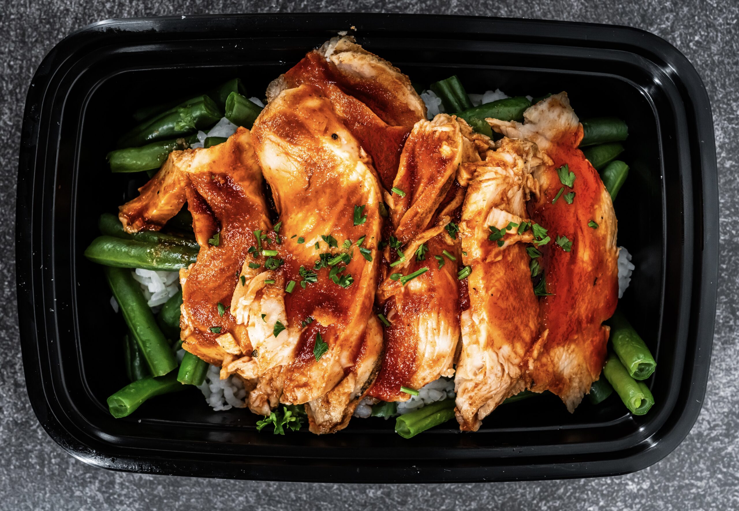 GRILLED CHICKEN WITH A HOUSE RANCH, SWEET AND SPICY SIRACHA MAPLE SAUCE SERVED OVER RICE AND GREEN BEANS!