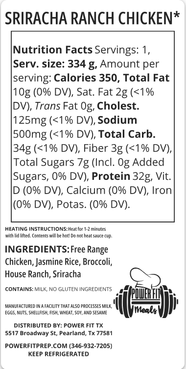 Sliced chicken breast served with Jasmine Rice, Broccoli, House Ranch, Sriracha