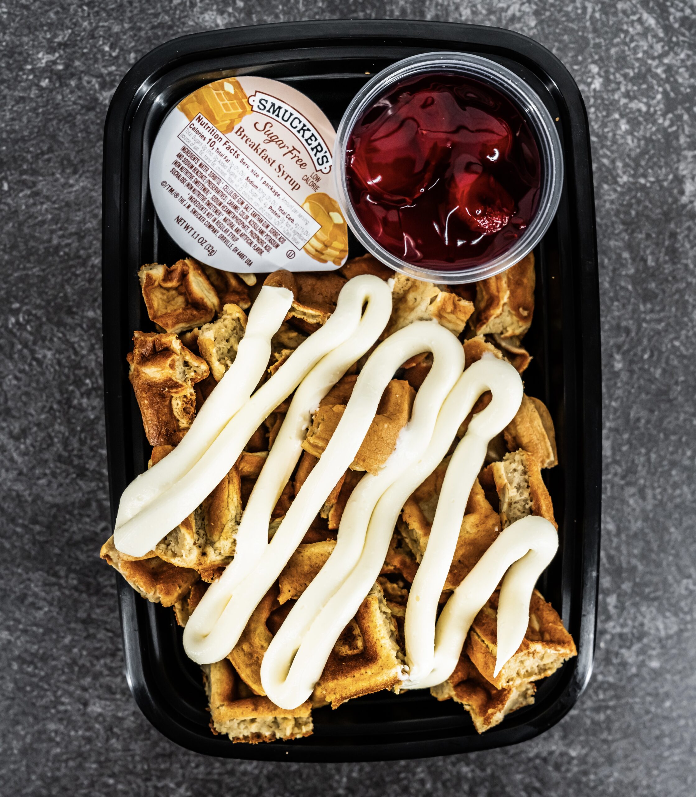 OUR FLUFFY PROTEIN WAFFLES TOPPED WITH SUGAR FREE CHEESECAKE SAUCE AND SUGAR FREE STRAWBERRY JAM!