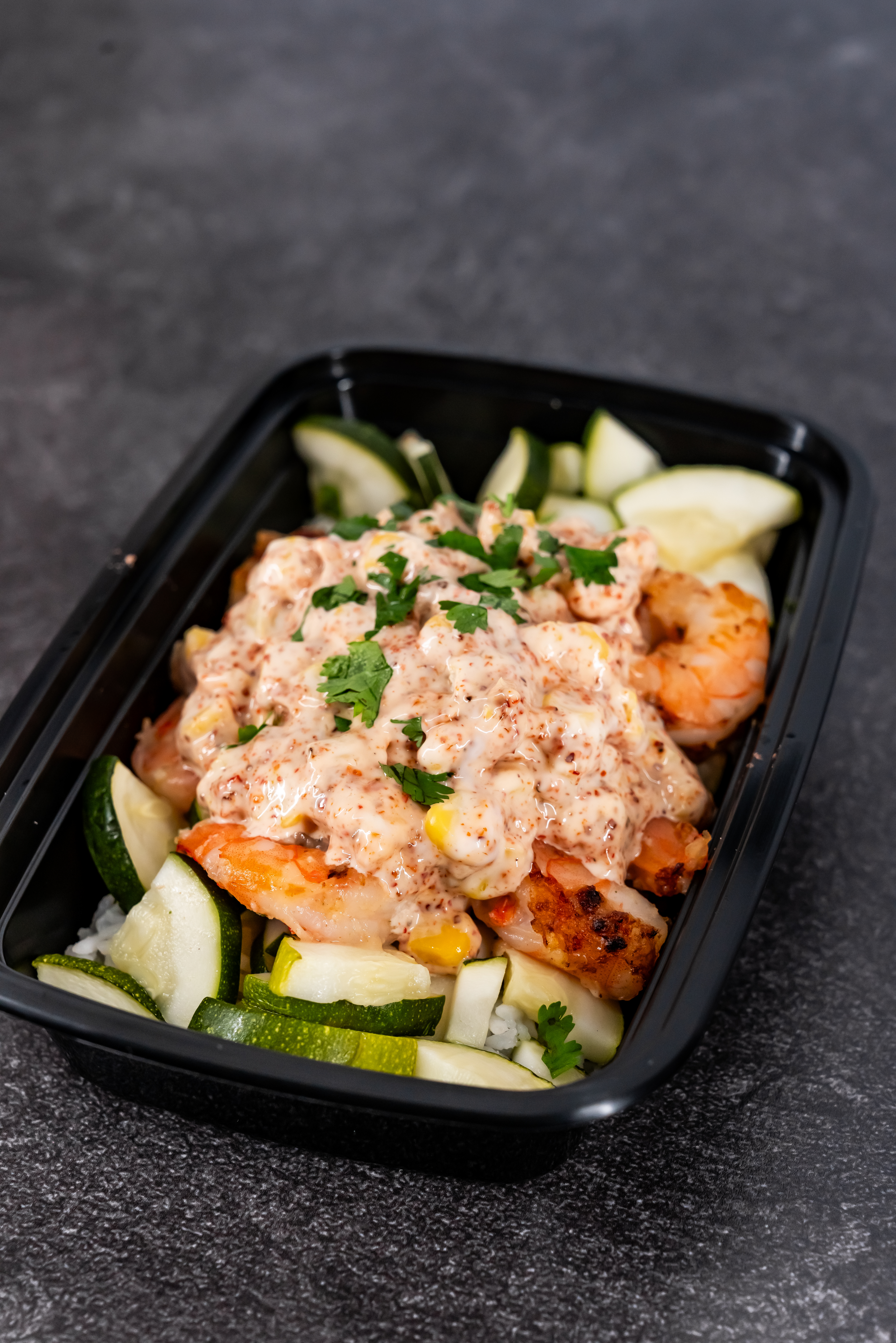 OUR FAMOUS STREET CORN DIP SERVED OVER TACO SHRIMP SERVED WITH RICE, ZUCHINNI AND BLACK BEANS.