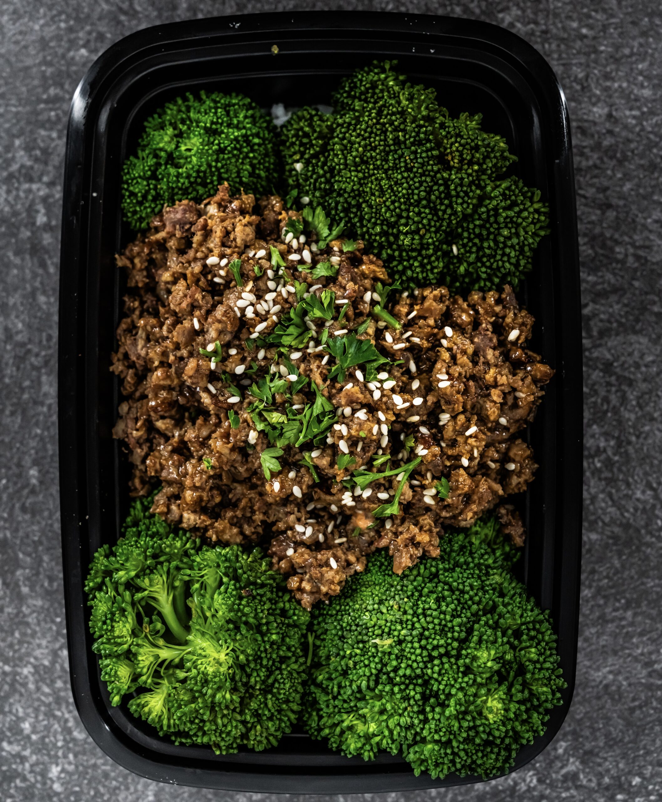 OUR LEAN GROUND TERIYAKI BEEF SERVED OVER BROCCOLI, RED & YELLOW BELL PEPPERS, AND RICE.